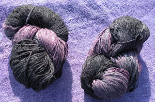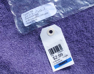 But here is the really wonderful thing that I found. I always take a peek for yarn when I'm at a thrift store. I think this is the best deal I've ever found. If you click on the picture you can see a larger version but here is what the original label says, “Country Silk, Black Orchid, Natural Silk Pack, 8-10 Ounces, 975-1200 Yards, $24.99.”
