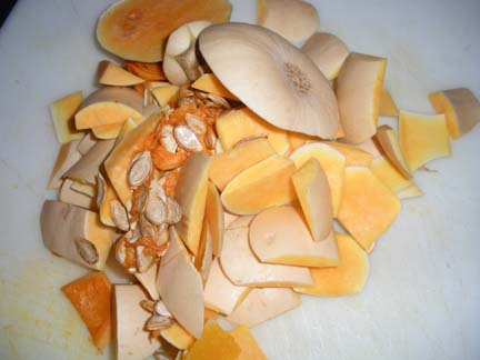 First I peeled, seeded and cubed the squash. Oops, these are the leftovers, which will go to our chickens. I will probably save some seeds to try and grow butternut squash next spring.
