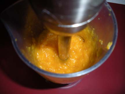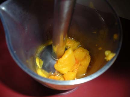 Next I dumped the butternut squash into the tall glass that came with our stick blender, and blended the squash until it was smooth.