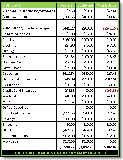 Groceries for the month came under the allotted $640. That is unless I find missing receipts. But I guess for the most part, the money is accounted for. We don't count change leftover when we use cash, we save it so that is sometimes why the money doesn't add up to exactly what was removed from the bank. For example, we withdraw $200 cash each week for groceries ($160/wk) and monthly allowance ($35/wk). I know I don't account for the extra $5 a week. I should. Maybe I will next month. It is just easier to get $200 from the bank. For November, the cash purchases recorded for those categories came up to $735. $65 is unaccounted for. I doubt that much wasn't saved in coins, so there might be a receipt hanging out somewhere, misplaced or lost. I can't keep track of every penny when Mr. A is the one using the cash that's withdrawn. Who knows he might be saving it to buy me something for Christmas. 🙂