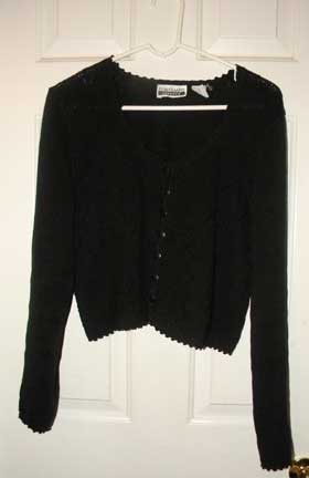 I just love the hand crocheted scallop around the edges of the entire sweater down to the sleeves. It has small buttons that run the length of it, and it goes perfectly with the dress.