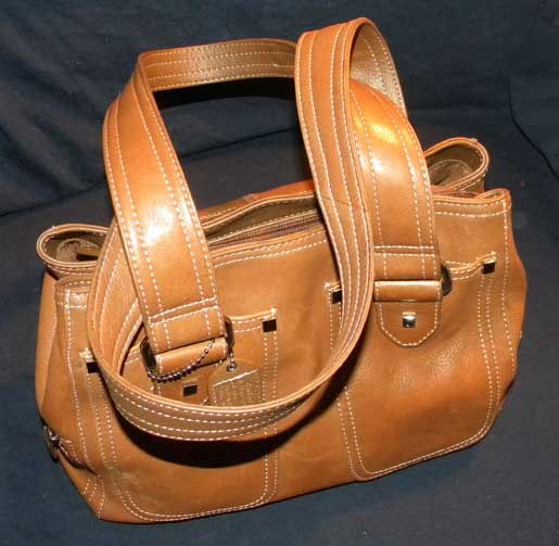 I wish it were black, but this is what I ended up with. So far it's working well. The brand is St. John's Bay and it says it is all leather. It cost $6.99 at Savers. It did not look as if it had been used. The insides were totally clean, no fuzz or ink stains. I'm very pleased with it.