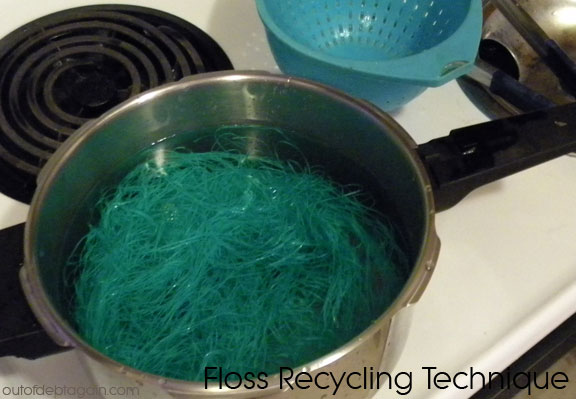 Remove the floss using the tongs and drop into a colander which has been set aside for this recycling process. Or you can sterilize your regular colander after usage. I recommend having a colander used specifically for this recycling project.