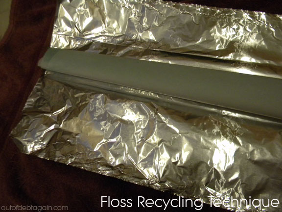 Finally, wrap the aluminum foil over the parchment paper. Leave one end open so that you can grab onto a piece of floss and pull out one at a time. It takes a little bit of practice to get used to the method but it will definitely be worth it when you see how much money you're saving on floss.