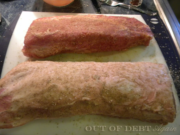 Take the rub and sprinkle on all sides of the pork loin, including the edges. Do not trim or remove any fat! In the photo below the tenderloin part which I mentioned earlier is on the bottom side. In the next photo you can see one half of the pork loin has the fatty side up, and the bottom loin has the meat side up. I've placed a bit of text to show you where the tenderloin tidbits can be found.