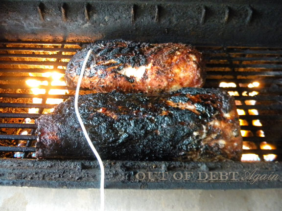 Light your grill and heat to 400°F. Place the pork loin over the flame and brown for 10 minutes on the top and bottom. As you can see in my next photo my pork loin ended up getting blackened on one side, which is okay since this was the side with the fat and I won't be eating that part anyway.