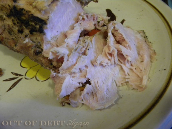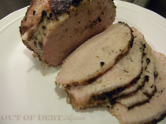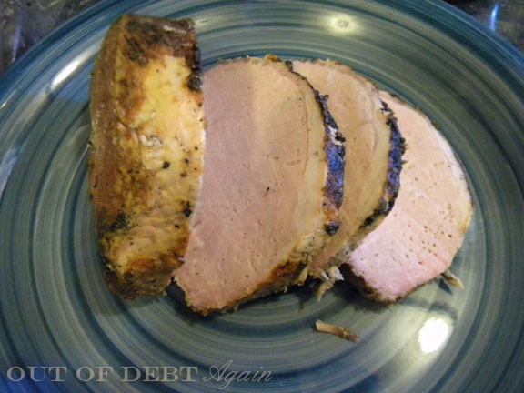 Here is a photo of how we had the pork loin for dinner. We sliced it and served with salad and steamed vegetables. We only ate a portion that first night, however. There was a lot left over. I'll share some other ways to use up the rest of your pork loin.